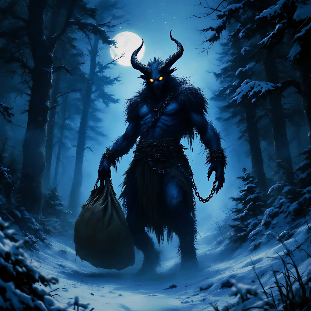 His name is derived from the German word “Krampen,” meaning claw, symbolizing his fearsome appearance with horns, fangs, and chains.